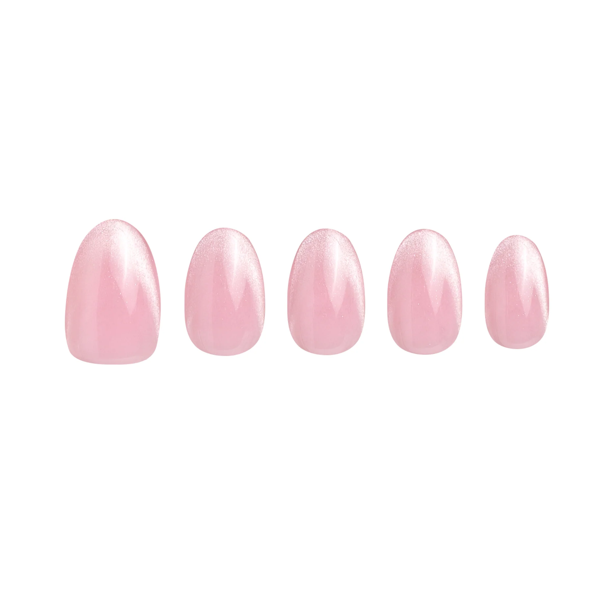 Blissful Brycelyn short almond press on nails come in a pink shiny finish with a cat eye nail design.