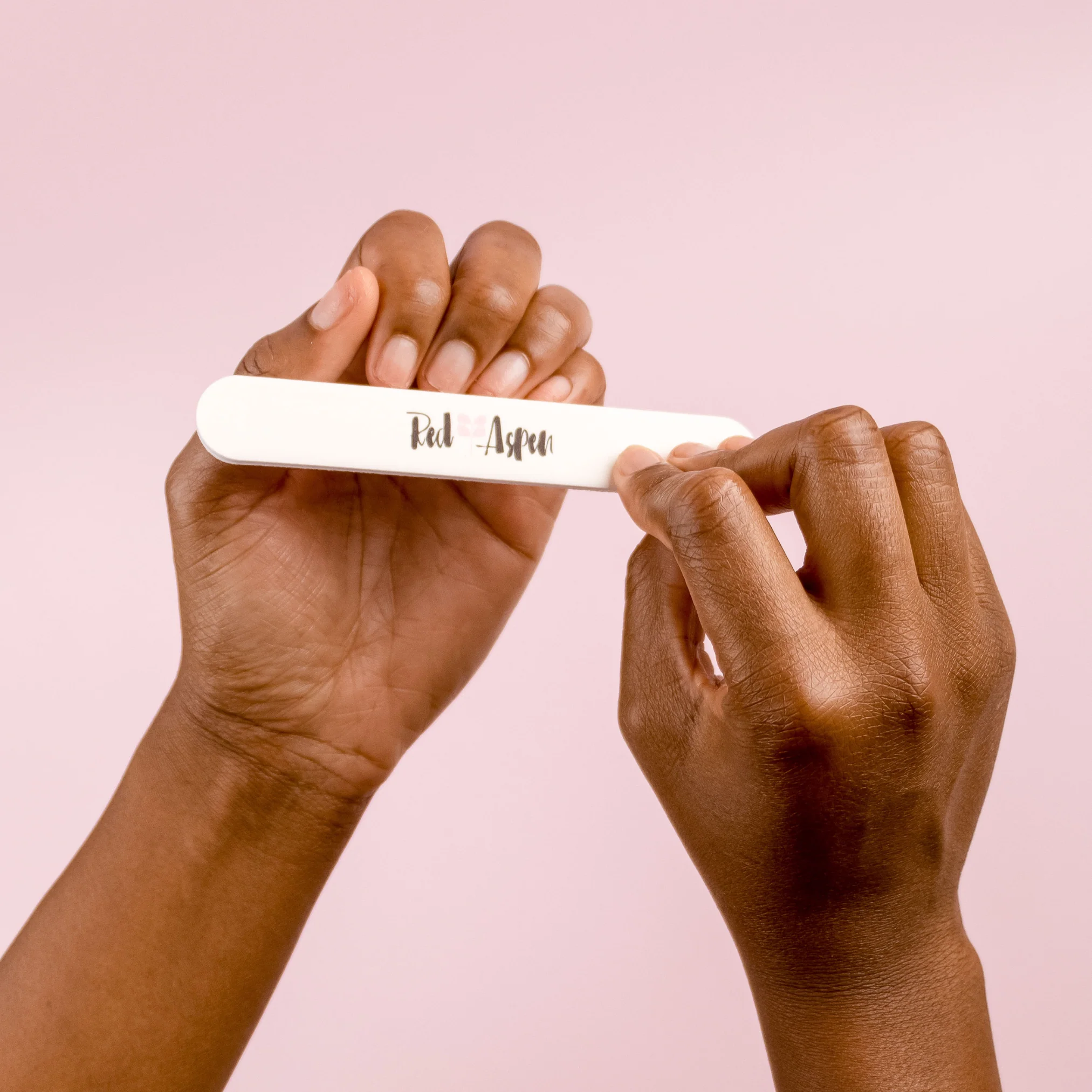 A 2-sided emery board, featuring two different grit finishes to shape nails.